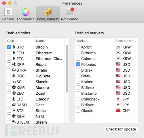 应用程序的首选项允许用户自定义显示有关各种加密货币的信息,包括比特币,Etherium和Monero。