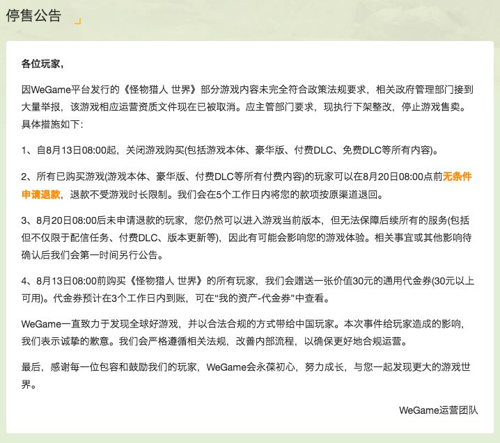 WeGame发布公告称,由于“部分游戏内容未完全符合政策法规要求”而遭到大量举报,接主管部门通知,游戏的运营资质文件已被取消,即日起停止《怪物猎人 世界》的购买,并从客户端下架。