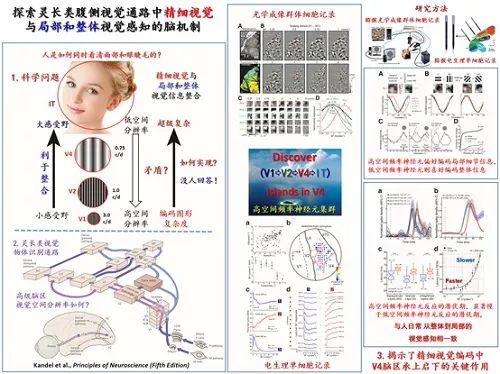 灵长类视觉系统通常被描述为一个从视网膜出发,由各个不同等级的视觉脑区组成的神经环路系统。初级和次级视皮层(V1和V2)神经元具有较小的时空整合感受野,偏好局部视觉信息,而从较高级视觉脑区V4和MT/MST开始,神经元普遍具有较大的感受野,适合整合较大视野内的视觉信息,从而完成整体视觉感知和认知功能。已有的教科书式的知识认为,在灵长类等级化的视觉系统中,伴随着神经元感受野的逐级增大,各个视觉脑区的最优空间分辨率逐级下降。那么精细视觉如何传递到高级视皮层如IT区进行物体识别和认知?这是视觉科学研究中的重大基础科学问题,至今没人能够回答。