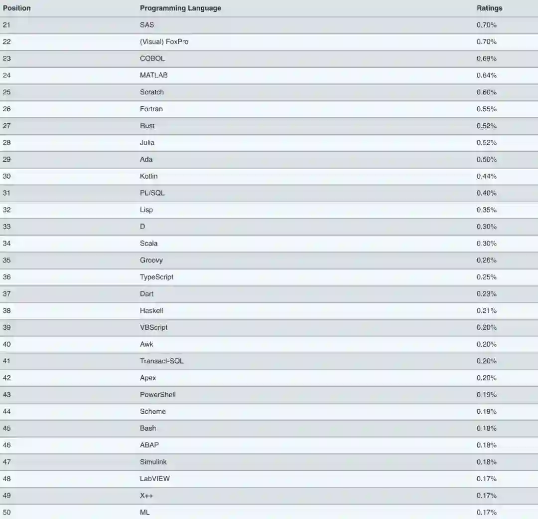 这个排行榜可以用来考察你的编程技能是否与时俱进,也可以在开发新系统时作为一个语言选择依据。