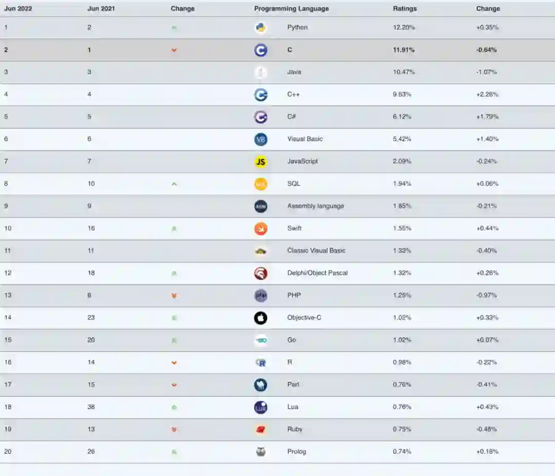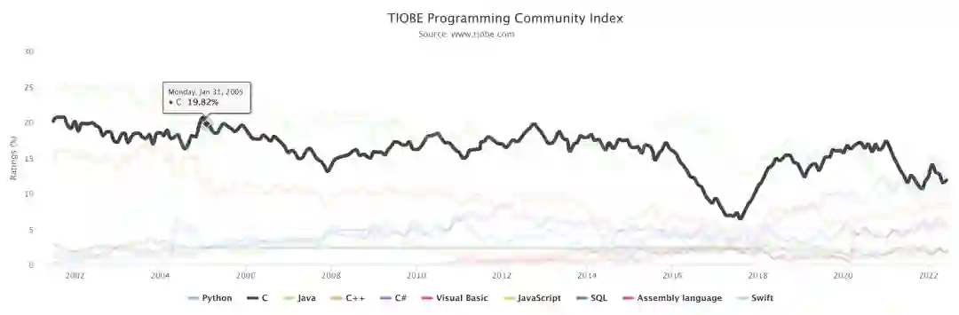 TIOBE 编程语言社区排行榜是编程语言流行趋势的一个指标,每月更新,这份排行榜排名基于全球技术工程师、课程和第三方供应商的数量,其中包括了流行的搜索引擎以及技术社区,如 Google、百度、维基百科、CSDN、必应、Hao 123 等等。具体的计算方式详见:https://www.tiobe.com/tiobe-index/programming-languages-definition/。请注意这个排行榜只是反映某个编程语言的热门程度,并不能说明一门编程语言好不好,或者一门语言所编写的代码数量多少。