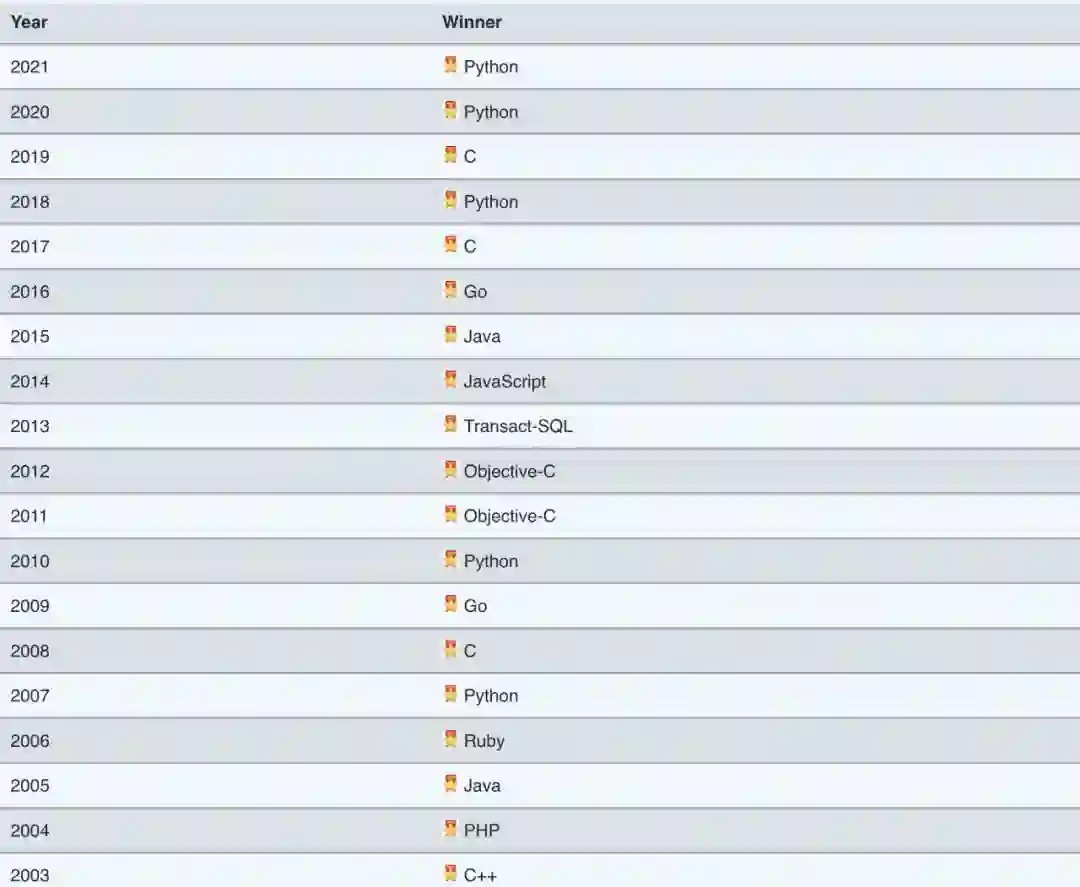 根据 TIOBE 历年的榜单显示,2020 年 4 月,Java 仍然是 TIOBE 指数的第一名。然而同月,Java 第一的宝座就被 C 占领了。后来,在 2021 年,Python 在人工智能这条大船下势不可挡,也超越了 Java。