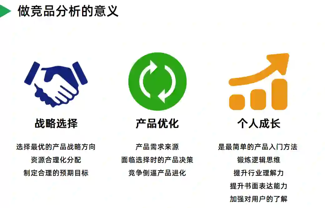 第二个意义是比较常见和能直观感受到的,即通过竞品分析得出产品优化的方向。我们去调研竞品做了何种需求,为何做这种需求,哪方面的数据特别好,通过这样的研究和对比来倒逼自己的产品发生成长。