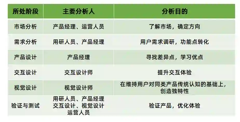 就像竞品分析,从产品系统出发,当产品处于市场分析阶段,竞品分析的目的是了解市场、确定方向;而当产品处于设计阶段时,竞品分析的目的是寻找差异点,学习竞品的优点。