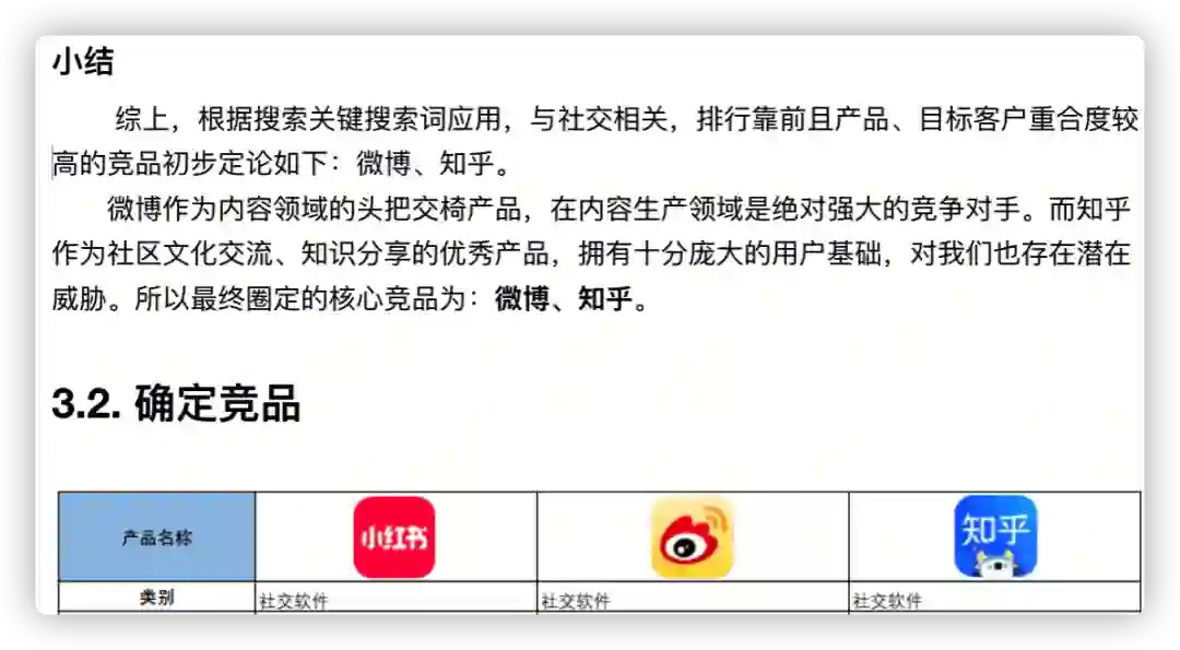 上图,A同学将小红书定位为社交产品,所以最终选定的竞品为:微博和知乎;