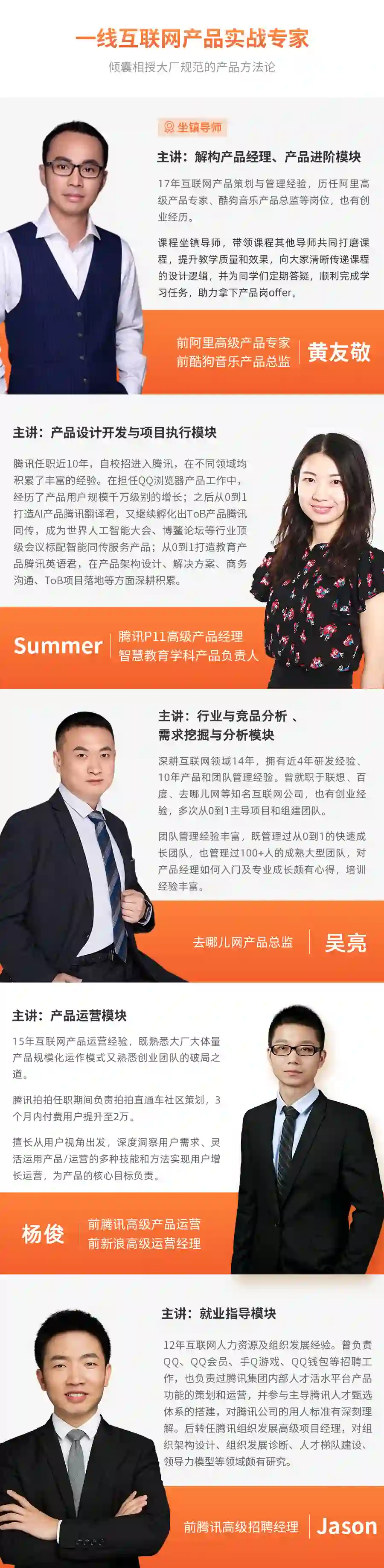 90天产品班的导师都来自BAT等大厂,平均工作年限在8年+以上,目前还在一线大厂工作,并且直播模式更能保证紧跟最新时事热点,还能与老师实时提问,保证学习效果。