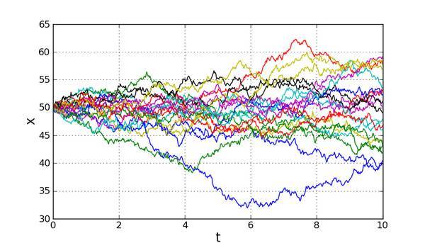 许多金融模型背后的想法可以追溯到1900年的Louis Bachelier,他认为股市波动可以用被称为布朗运动的随机过程来建模。在每一个瞬间,股票价格或者增加或减少,该模型假定这些事件有固定的概率。它们可能是等可能的,或某个比其它的可能性大。这就像人站在街道上,反复掷硬币来决定是否向前移动一小步或向后,他向前向后反复无常。他的位置对应股票价格,随机上涨或下跌。布朗运动的最重要的统计特征是它的均值和标准差。均值是短期的平均价格,通常在一个特定的方向漂移,上升或下降取决于股市。标准差可以认为是价格偏离均值的平均量,它有标准的统计公式来计算。对于股票价格,这被称为波动,它衡量价格波动的稳定性。在时间价格图上,波动对应锯齿状的曲折走势。