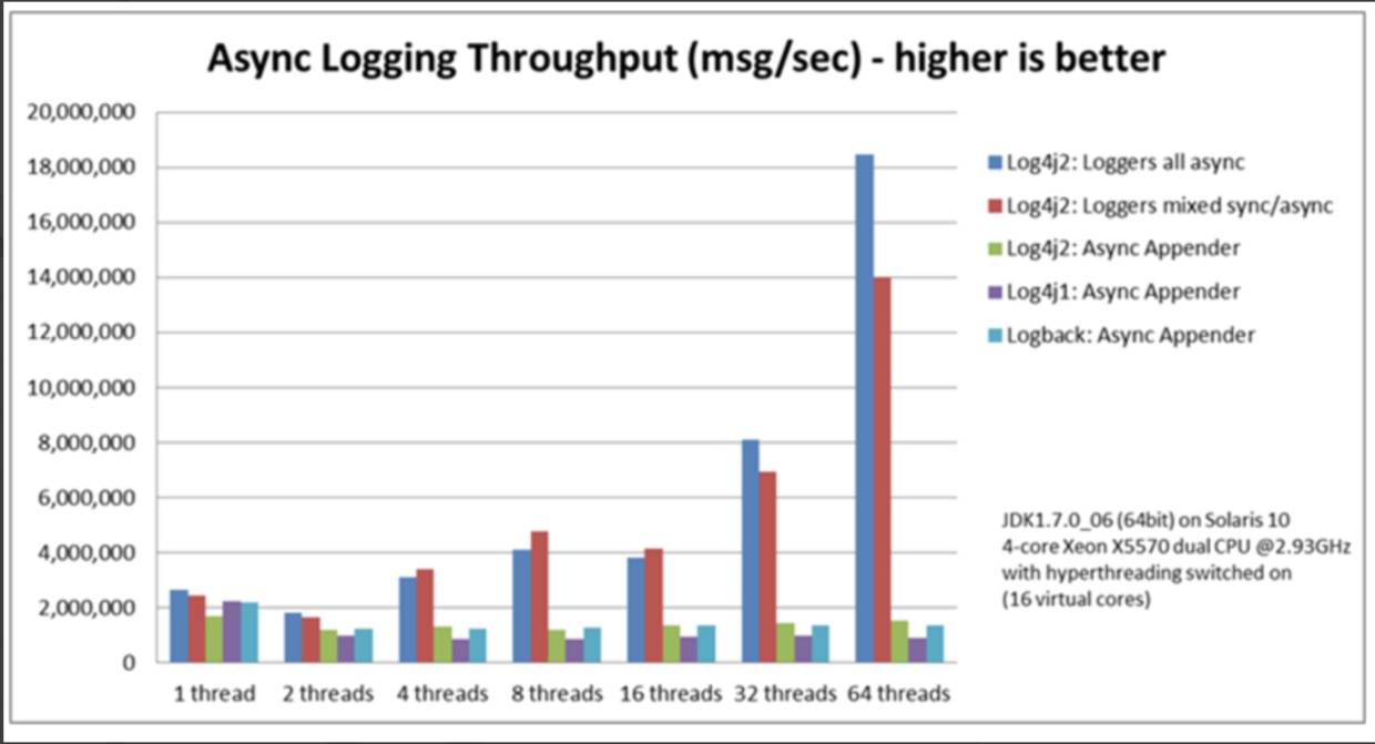 新的Log4j 2.0版本有了大幅的性能提升、新的插件系统,以及配置设置方面的很多改善。Log4j 1.x 在高并发情况下出现死锁导致cpu使用率异常飙升,而Log4j2.0基于LMAX Disruptor的异步日志在多线程环境下性能会远远优于Log4j 1.x和logback ——官方测试结果。
