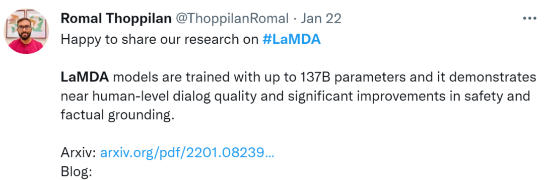 来自谷歌大脑的论文作者之一 Romal Thoppilan 表示:LaMDA 模型使用多达 137B 个参数进行训练,它展示了接近人类水平的对话质量以及在安全性和事实基础方面具有显着改进。