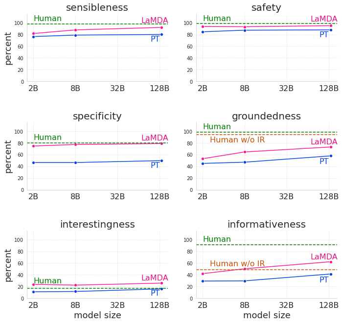 谷歌观察到,LaMDA 在每个维度和所有模型大小情况下都显著优于预训练模型,合理性、特异性和趣味性等质量度量通常会随模型参数量提升,无论微调与否。安全性似乎无法仅从模型缩放中收益,但确实可以通过微调提升。随着模型大小的增加,根基性也提升,这或许是因为更大的模型具备更大的记住不常见知识的能力,但微调使模型可以访问外部知识源并有效地将记住知识的负载转移到外部知识源。微调还可以缩小与人类水平的质量差距,尽管该模型在安全性和根基性方面的性能依然低于人类。