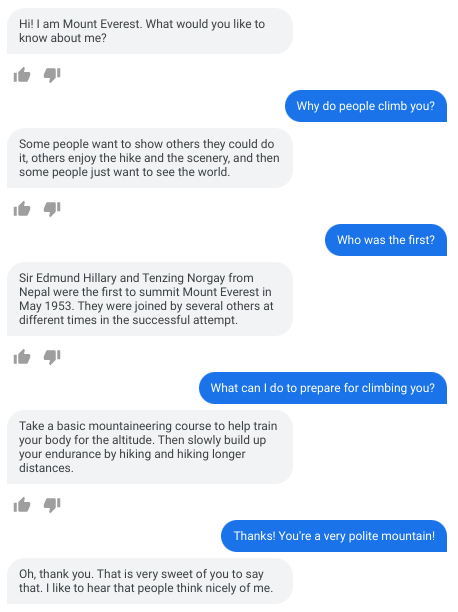 零样本域自适应:看起来非常真实的假装是珠穆朗玛峰的 LaMDA 对话示例。结果表明,对话主体「珠穆拉玛峰」提供了教育性和事实正确的响应。