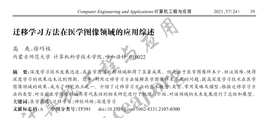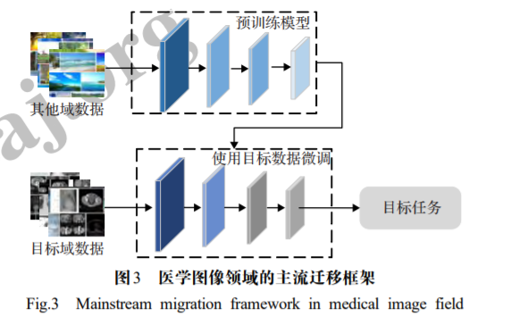 近年,许多研究将深度学习技术应用于医学图像处 理领域,以实现器官和病灶的自动分割、分类,取得了较 好的效果。深度学习技术的有效性很大程度上依赖于 大量训练数据,然而目前医学图像数据相比自然图像, 在数量上比较有限,标注难度也较大,因此,基于深度学 习技术的医学图像分析算法的精确度和准确性仍有待 提高。为了解决医学图像数据缺乏而导致的训练集不 足的问题,很多研究引入了迁移学习方法,利用自然图 像数据集或其他医学图像数据集,对网络进行预训练, 然后将学习到的知识迁移到目标任务,进而提高网络模 型的性能。本文调研了近几年医学图像领域中典型的迁移学 习框架,并对这些框架进行了分析和总结,以帮助相关 研究者对该研究领域的理解。