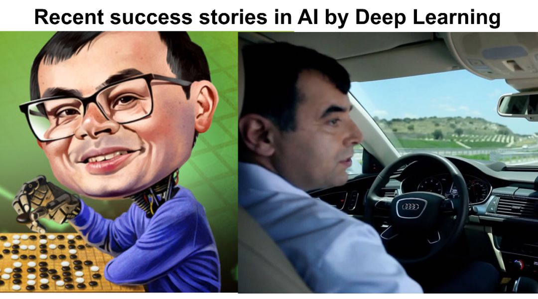 过去五年,人工智能领域最重要的两个成就是:AlphaGo 和自动驾驶。我在这行待了很久,因此两个领域都有我的学生:一个是 AlphaGo 的 Hassabis,他是 DeepMind 员工,现在在谷歌;另外一个就是 Moblieye 的 CEO Amnon Shashua,现在已经加入了英特尔。