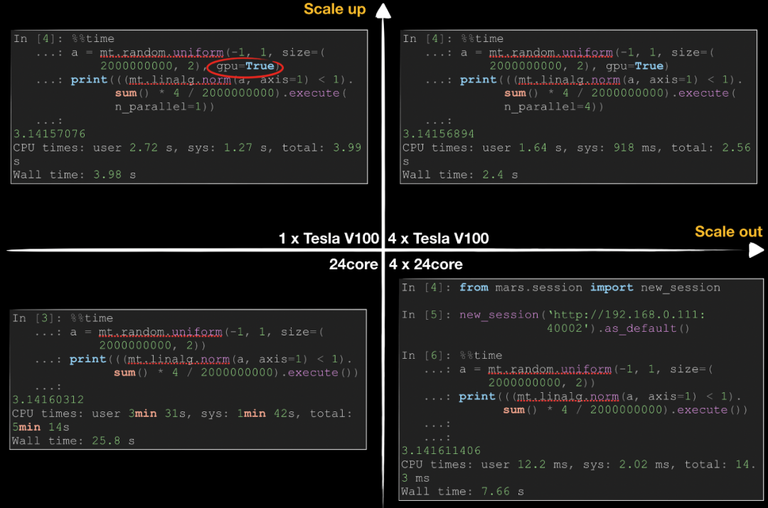 data = mt.random.uniform(-1, 1, size=(N, 2))inside = (mt.linalg.norm(data, axis=1) < 1).sum()pi = 4 * inside / N # 不需要调用 .execute() 了print('pi: %.5f' % pi.fetch()) # 目前需要 fetch() 来转成 float 类型,后续我们会加入自动转换