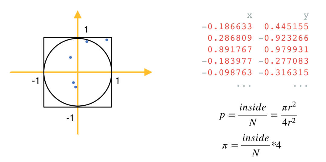 data = cp.random.uniform(-1, 1, size=(N, 2))inside = (cp.sqrt((data ** 2).sum(axis=1)) < 1).sum()pi = 4 * inside / Nprint('pi: %.5f' % pi)