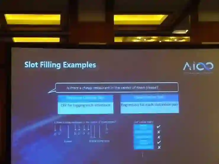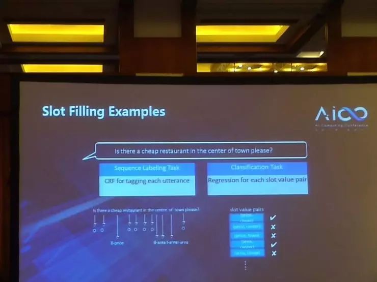 比如说用户的问题是在小镇中心有没有一个比较便宜的餐馆,这个时候我们可以把它形式化成一个序列标注的任务。可以给每一个词打上这样的标签,你也可以做成二元组的方案,有很多种组合,Price 的槽和 Cheap 是正位,每一个槽可以做很多交叉组合,形成标注样本,最后做分类模型。比较广泛采用的是通过用户的一段表达,可以把用户这段表达中我们所需要的一些信息抽取出来,填充到对应的槽中。