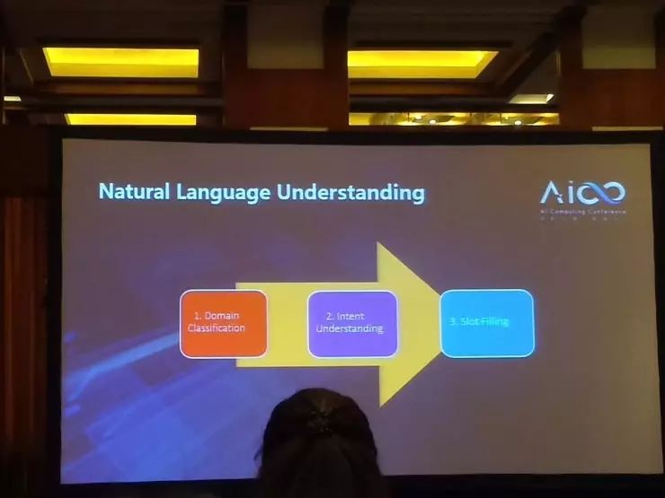 这里面涉及到三个具体的子模块,一个是用户分类。比如说用户说了这么一段话,我想买一部红色手机,适用人群是女士,这个时候我们就把它分到用户购物领域,识别到用户的具体意图是购物,而不是听音乐或者问天气。