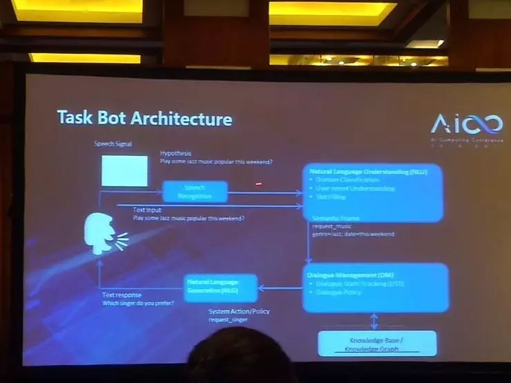 基于刚才的例子,播放本周最流行的爵士乐,这时候我会问你想听谁的爵士乐,另外一种类型是直接给用户播放本周最流行的音乐,用户点击之后就可以播放。这一步之后要经过自然语言生成,根据当前用户输入和当前会话状态,决定是反馈用户一首音乐的播放链接,还是再询问用户希望听哪个歌手的爵士乐。这部分要根据响应做一个自然语言的生成,返回用户,这样就是一个多轮交互或者单轮交互的过程。