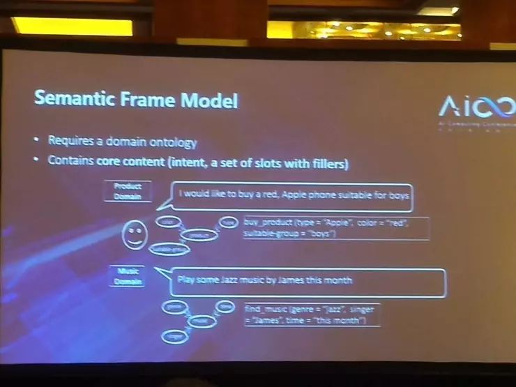 我们经常用到的是框架语义模型。有两个例子,一个是购物领域的例子,一个是听音乐的例子,都是具体要完成某一个任务的助理型机器人。比如,用户需求是我想买一个红色苹果手机,适用人群是男士,这个时候我们的框架语义模型就会把颜色、品牌以及适用人群这三个槽值抽取出来填充到对应的槽位,一个是颜色、一个是品牌、一个是适用人群。