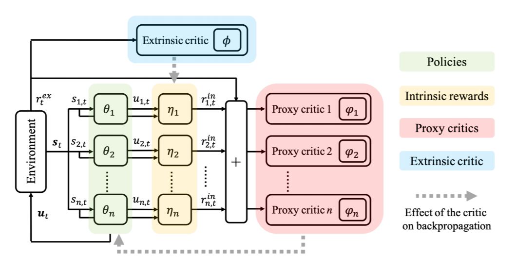 具体来说,特定智能体的内在报酬将涉及为其计算一个不同的智能体批评机制,以指导其个别策略的更新。同时,将对参数化的内在奖励功能进行更新,使其最大程度地满足环境对团队累积奖励的期望,从而使目标与原 MARL 问题保持一致。