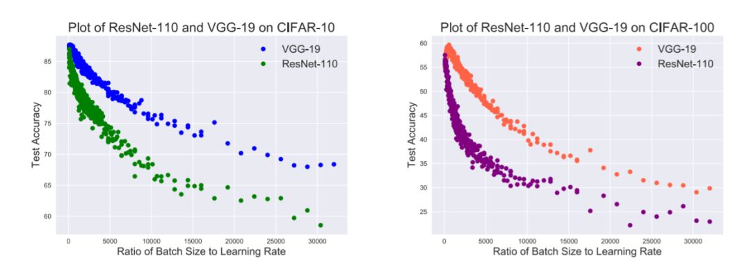 此外,我们进行了一项旨在验证相关性和训练策略的大规模实验。我们在严格控制不相关变量的同时,使用数据集 CIFAR-10 和 CIFAR-100 对基于架构 ResNet-110 和 VGG-19 的 1600 个模型进行了训练。我们采集了测试集的准确性以进行评估。我们采集的 164 组数据中,Spearman 的排名相关系数和对应的 p 值表明,相关性具有显著的统计学意义,完全支持训练策略。