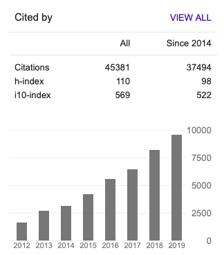这些荣誉是和他巨量的、且重要的研究成果分不开的。截止2019年12月,Google Scholar显示他的引用已经达到45000+,h-index为110。