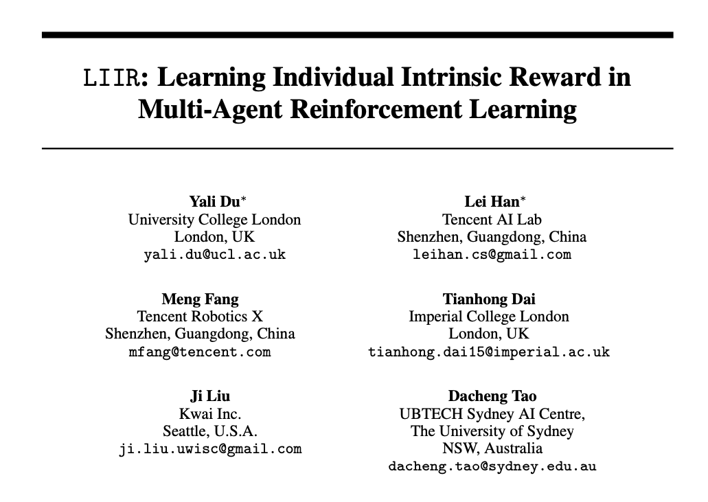 论文地址:https://papers.nips.cc/paper/8691-liir-learning-individual-intrinsic-reward-in-multi-agent-reinforcement-learning.pdf