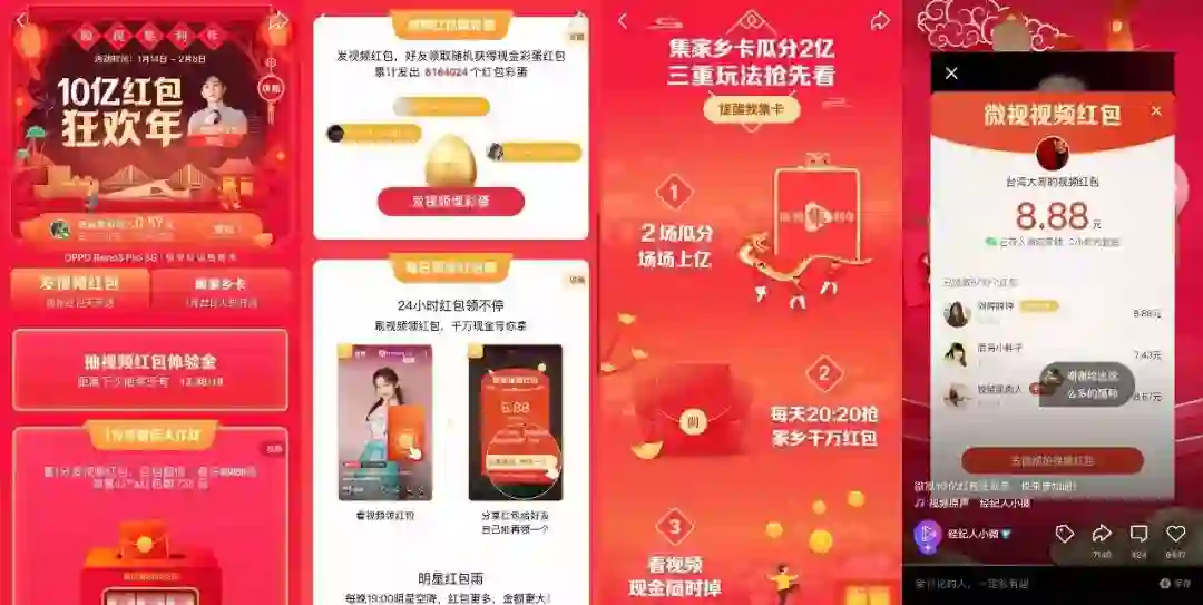 今年微视拿出10亿推出了春节红包活动,包括“发视频红包”、“集家乡卡”、“明星红包雨”等多种玩法,其中8亿分给了“一分钟翻倍大作战”、“视频红包藏彩蛋”以及“发视频抽取红包体验金”三大板块,在“一分钱翻倍大作战”中,用户可以通过抽奖或者邀请好友的方式获得参与资格,随后选择模版制作视频红包,支付1分钱,微视将把红包变大,最高888元,邀请好友还可以一起拆先进红包。
