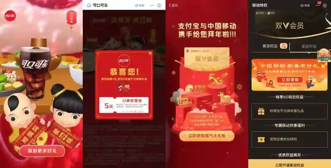 可口可乐已经与“五福”活动合作了五年,今年可口可乐联合支付宝一起推出了“扫福娃赢好礼”和“扫福娃集福卡”活动,用户通过扫一扫印在可乐瓶身的福娃,福娃就会以AR的形象呈现在用户眼前,画面中会有可口可乐产品及醒目logo,之后还可进入签到抽奖环节,随机发放饿了么、淘票票优惠券以及现金红包等特别奖。