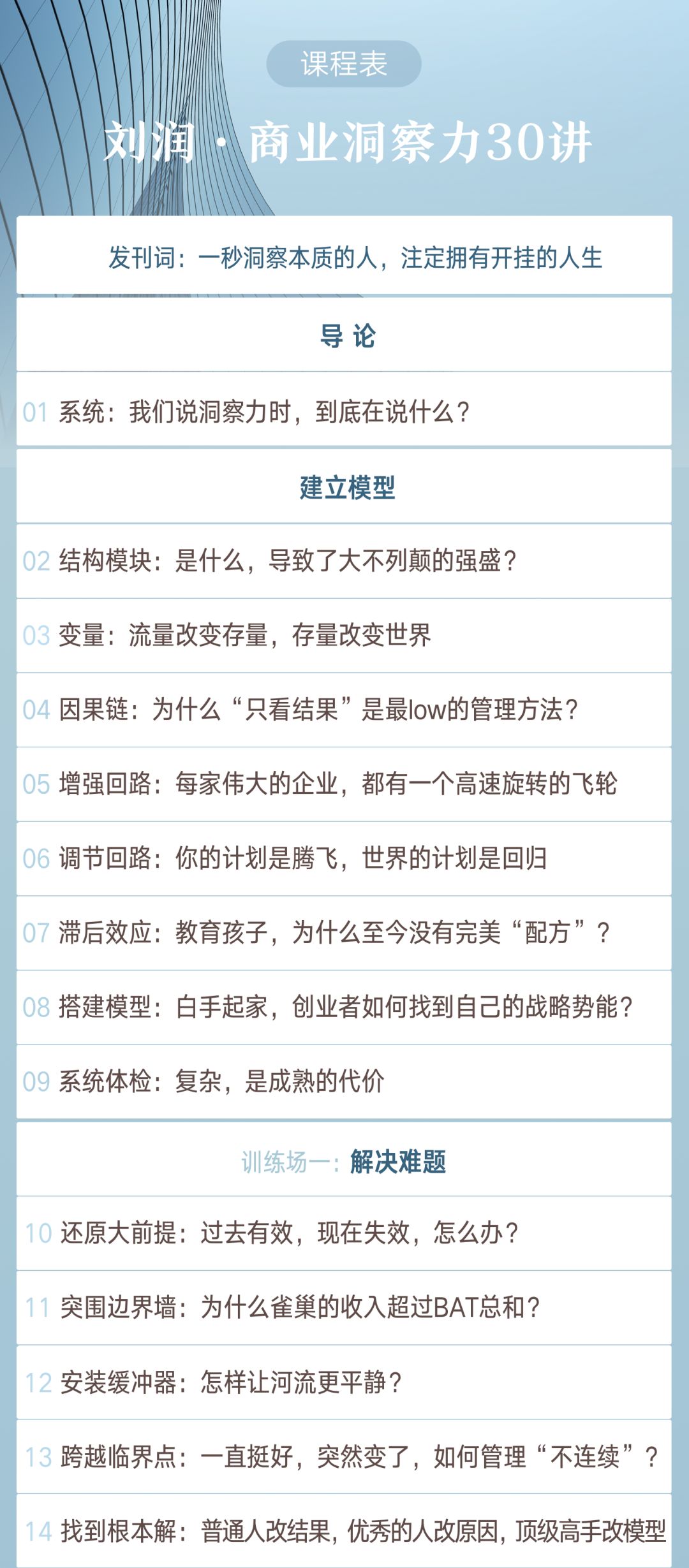 训练场四:终身练习。洞察力不是一朝一夕就能练成的,刘润会带你破除顽固的三大思想误区,给你终身修炼的秘笈,然后目送你下山。