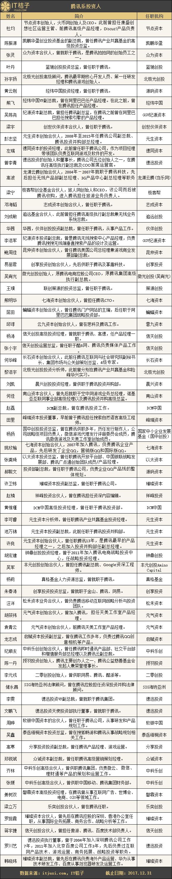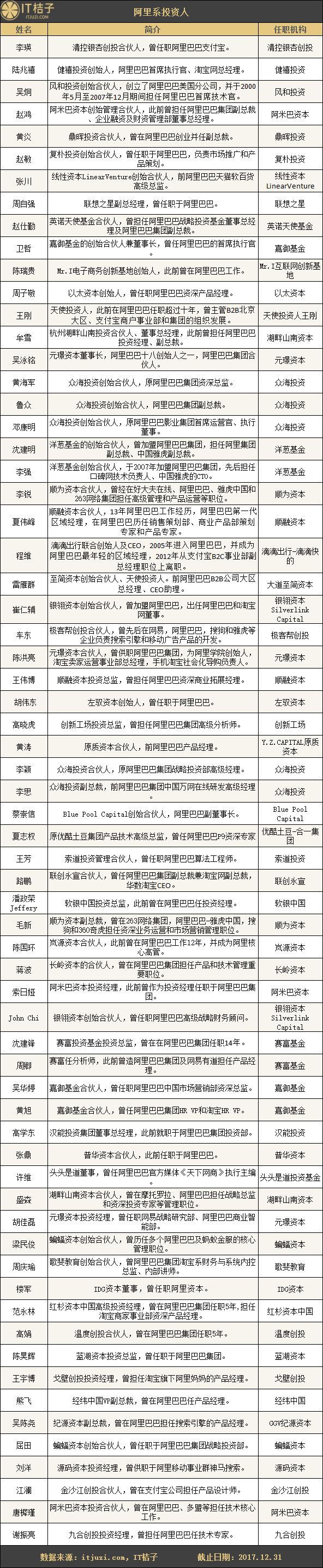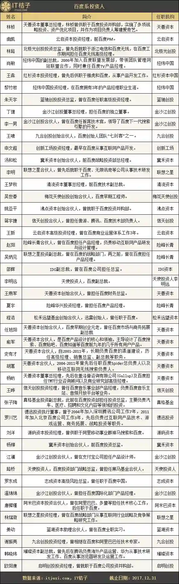 以下为 IT 桔子(ID:itjuzi521)收录的 BAT 背景的投资人: