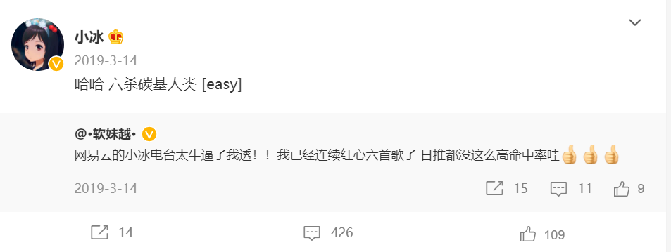 至于小冰框架为网易云音乐的云圈群聊专门打造的人工智能唠嗑小泡泡、桌游圈圈仔和占卜喵喵,更是技能各有所长、性格各不相同,随时随地在近万个云圈群中与人类小伙伴相依相伴,聆听人类的倾诉,排解人类的烦恼。