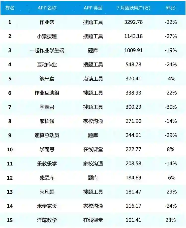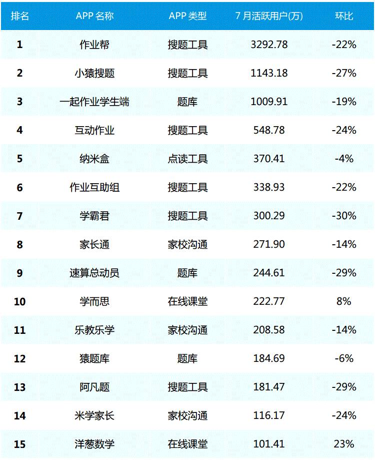 7月暑假期间,中小学类教育领域月活人数表现出下滑趋势。7月领域TOP15中洋葱数学和学而思月活环比有所增长。假期到来,不少父母会要求孩子巩固本学期课程或学习下学期新课程,在线课堂类应用的上涨不难理解。而假期时间,作业完成的时间较为宽松,搜题等工具类应用使用场景减少,小猿搜题、互动作业、作业互助组、速算总动员、阿凡题等月活则出现下跌。乐教乐学,作为家校沟通的APP,环比下跌了14%,不难看出暑期学校都放假了,学校和家长、学生的沟通自然在减少。