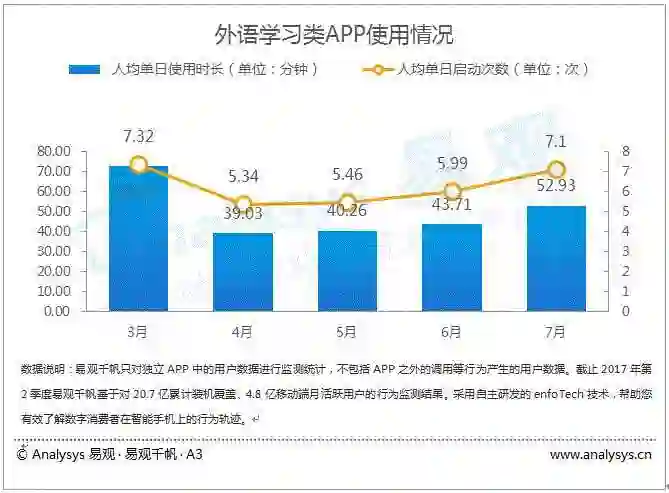 外语学习APP在七月份的暑期节点上各项指标均有所增长,即领域整体月活、人均单日使用市场和次数都呈现出向上的趋势。暑期时点上大家学习英语的热情有所增加。