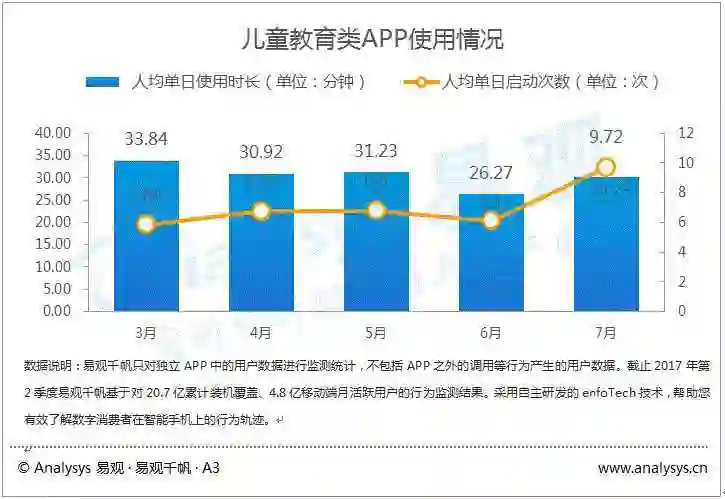 七月属于暑假开端,年轻父母将会在儿童教养上投入更大精力。虽然儿童教育类应用整体月活呈现下降趋势,但是儿童教育领域TOP15中儿歌、动画视频、游戏等领域增长明显。儿童教育领域整体月度活跃人数规模并没有因为假期的到来出现明显周期性变化,但是从人均单日使用时长和启动次数来看,假期中儿童教育用户的使用频率和时长增加。