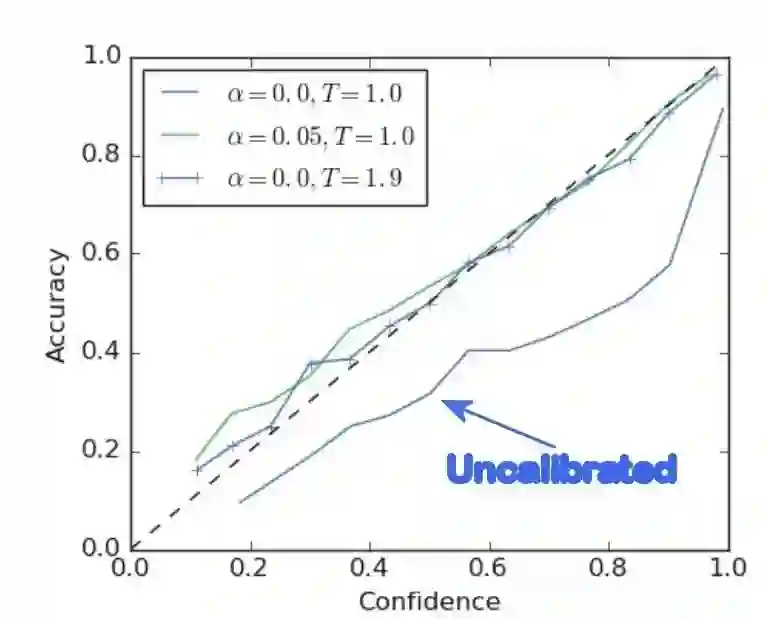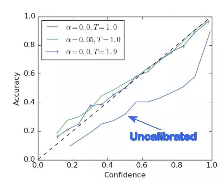 与未校准的网络相比,标签平滑极大地提高了置信度/准确率。其结果几乎与使用温度缩放进行手动调节相同。