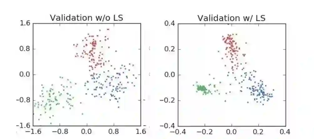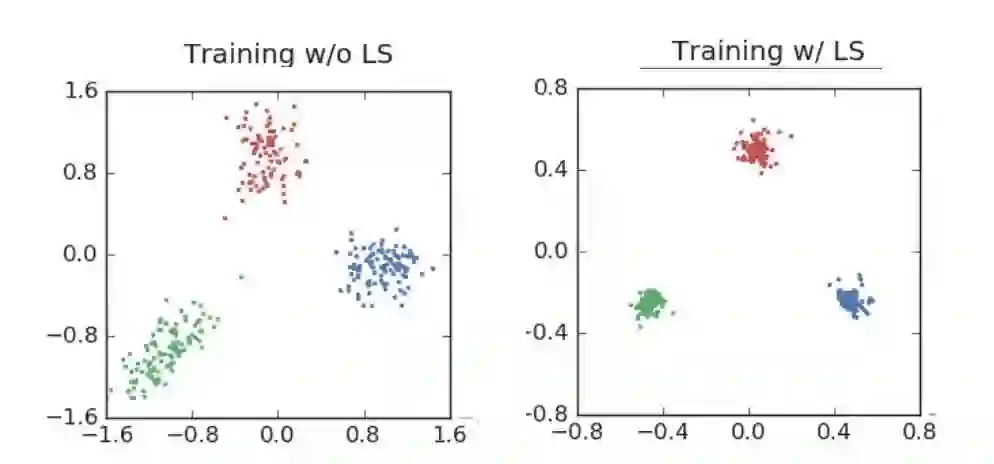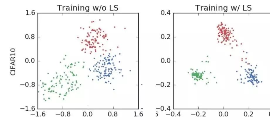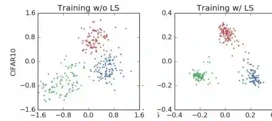 正如图像所显示的,标签平滑为最终的激活产生了更紧密的聚类和更大的类别间的分离。