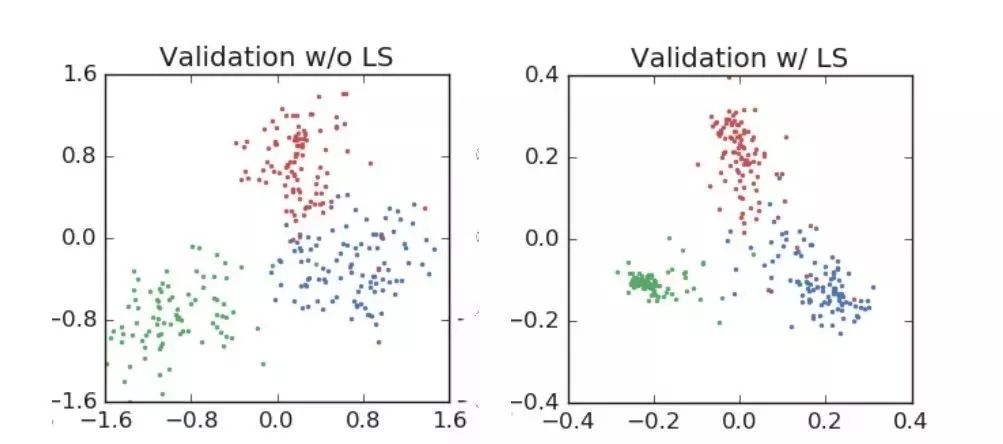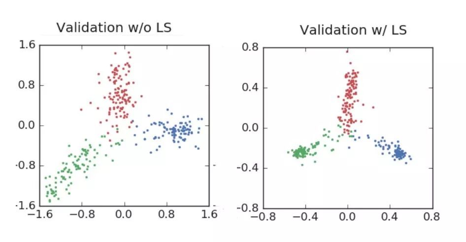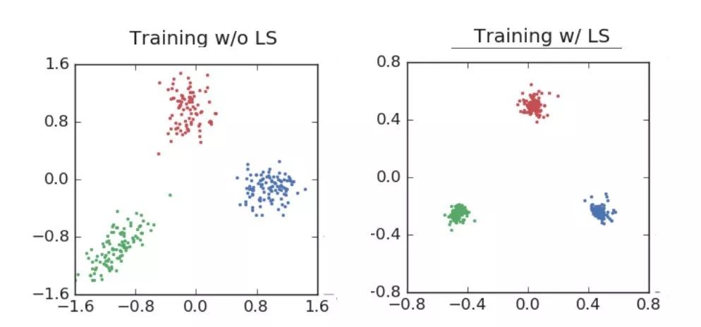 左:没有使用标签平滑进行训练,右:使用标签标签平滑进行训练