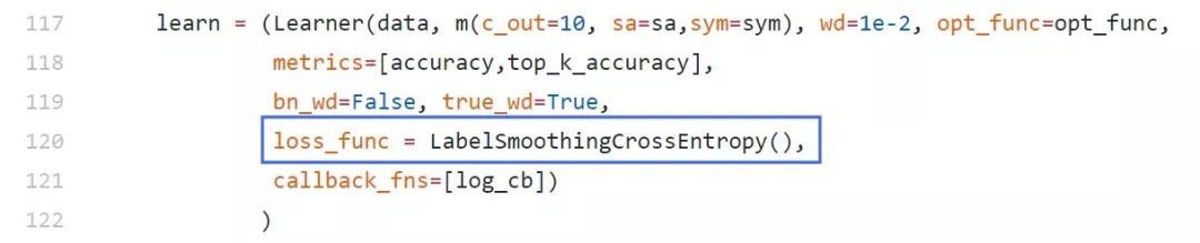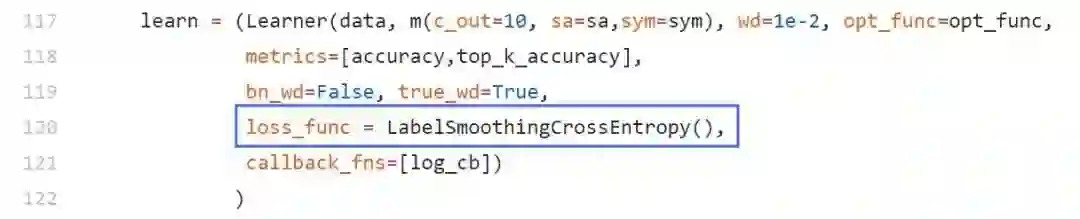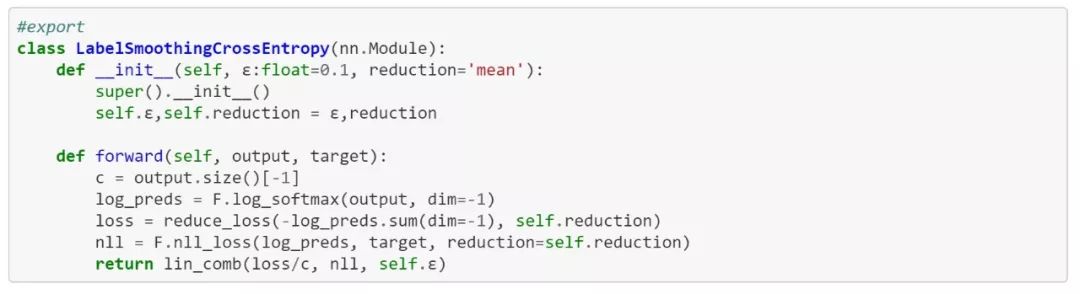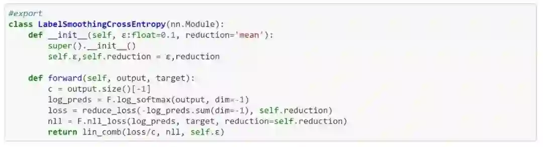 可以看到,代码中的标签平滑有助于理解它如何比通常的数学运算更好地工作(来自 FastAI github)。ε 是标签平滑调整因子: