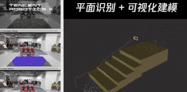 同时,利用算法识别和提取出台阶和梅花桩的表面区域范围和中心点位置,将定位和识别的数据进行融合,从而重建出整个三维运动场景。