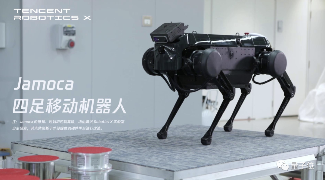 这只四足机器人名叫Jamoca,由腾讯 Robotics X 实验室打造,借用了云深处的硬件来承载系统技术。
