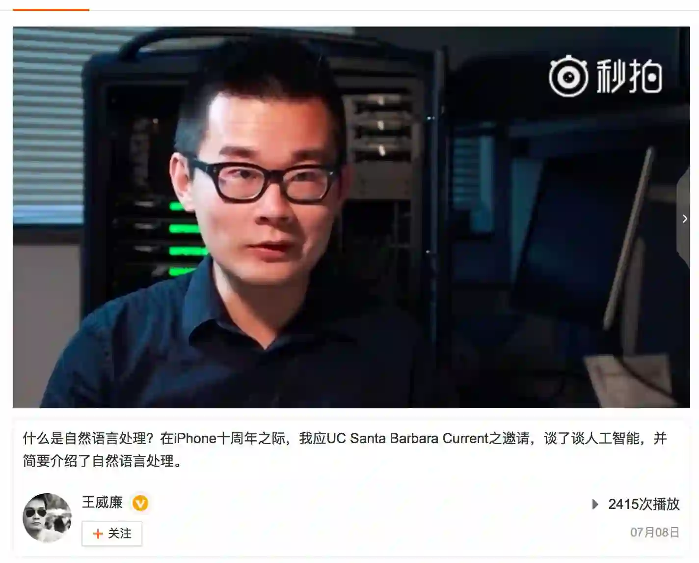 王威廉在国内关注人工智能领域的人群中颇有名气,他的微博成为不少人了解 AI 领域动态的渠道之一。这位 UC Santa Barbara计算机科学系助理教授、CMU 博士日前接受了 UC Santa Barbara Current 的采访,他如此描述此次采访:“什么是自然语言处理?在 iPhone十周年之际,我应 UC Santa Barbara Current 之邀请,谈了谈人工智能,并简要介绍了自然语言处理。 ”