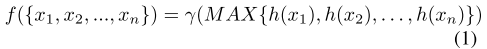 对于上述的第一个问题,可以从两个方面考虑:全局特征中每个维度都学习到了什么;全局特征中每个维度的重要性如何。给定无序点云集合{x1, x2, ..., xn},PointNet 可以定义为一个集合的函数 f,将一个集合映射为一个向量,如下式所示,其中 r 和 h 是多层感知机 MLP 网络: