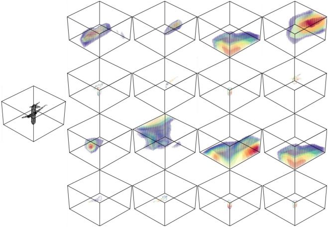从图 2 可以看出每个点函数可以检测一定范围内的点,并且有不同的激活值。以飞机为例,不同的点函数可以对机翼、机头、机尾等产生响应。另一个发现是各个点函数的激活区域有很大的重叠,这样的好处是当其中一个函数未成功检测时,其他的函数仍可以检测到重要的部分。但是这样也造成了太多冗余的信息,也会损害网络的可解释性。