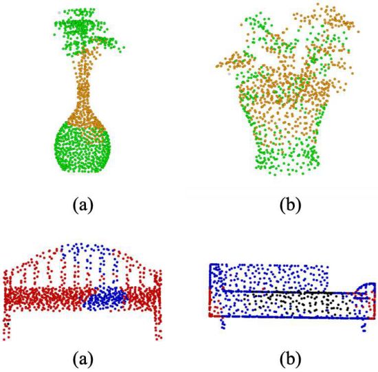 本文提出的 C-PointNet 可以在达到与 PointNet 对等的分类精度下(88.0%)探索网络决策的过程。如图 3 所示,正确分类的点云中的大部分点都对预测标签有贡献,但是被错误分类的点云中的点可能对其他标签有贡献。图 4 进一步展示了当一对点云具有相似的形状时,其类别特征响应图也可能很相似,这意味着这两类点云很容易被错误分类。