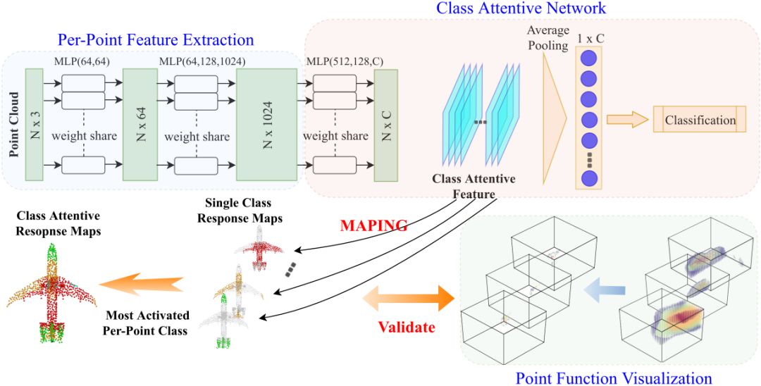 解释PointNet的过程如图1所示,首先,可视化点的函数,随后使用C-PointNet来提取细致的类别全局特征(包含逐点特征提取和类别特征提取)。最后计算类别相关的特征响应来探索决策过程。