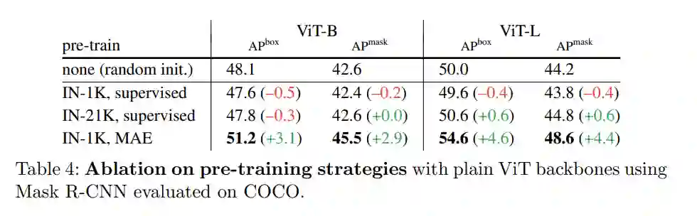 3、掩蔽自编码器可以提供强大的预训练主干。表 4 比较了主干预训练的策略。