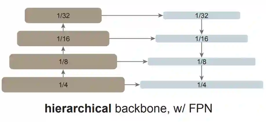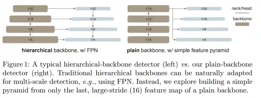 当前的目标检测器通常由一个与检测任务无关的主干特征提取器和一组包含检测专用先验知识的颈部和头部组成。颈部 / 头部中的常见组件可能包括感兴趣区域(RoI)操作、区域候选网络(RPN)或锚、特征金字塔网络(FPN)等。如果用于特定任务的颈部 / 头部的设计与主干的设计解耦,它们可以并行发展。从经验上看,目标检测研究受益于对通用主干和检测专用模块的大量独立探索。长期以来,由于卷积网络的实际设计,这些主干一直是多尺度、分层的架构,这严重影响了用于多尺度(如 FPN)目标检测的颈 / 头的设计。