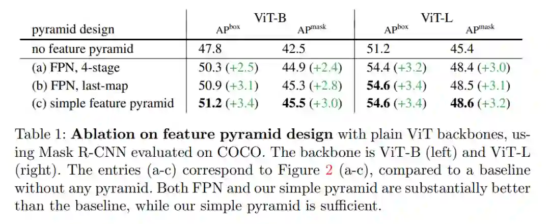 1、一个简单的特征金字塔就足够了。在表 1 中,他们比较了图 2 所示的特征金字塔构建策略。