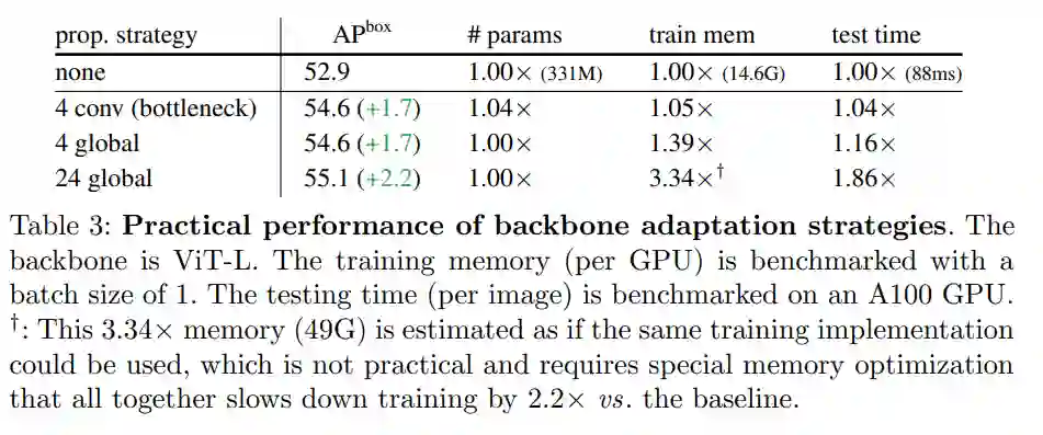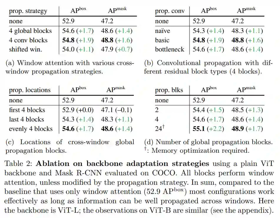 2、在几个传播块的帮助下,窗口注意力就足够了。表 2 总结了本文提出的主干调整方法。简而言之,与只有窗口注意力、无跨窗口传播块的基线(图中的「none」)相比,各种传播方式都可以带来可观的收益。
